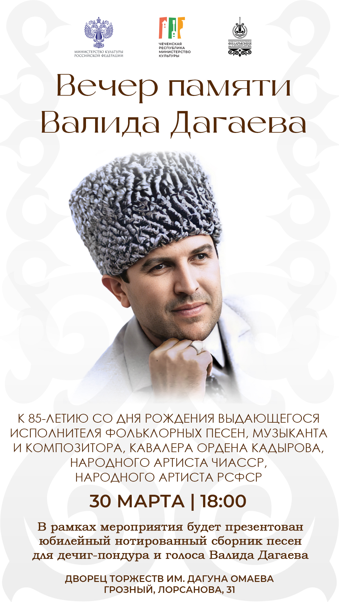 30 марта 2026 года Чеченская государственная филармония им. А. Шахбулатова проведет Вечер памяти, посвященный 85-летию со дня рождения Народного артиста РСФСР Валида Дагаева. Мероприятие состоится в рамках реализации гранта Министерства культуры РФ в сфере народного творчества.