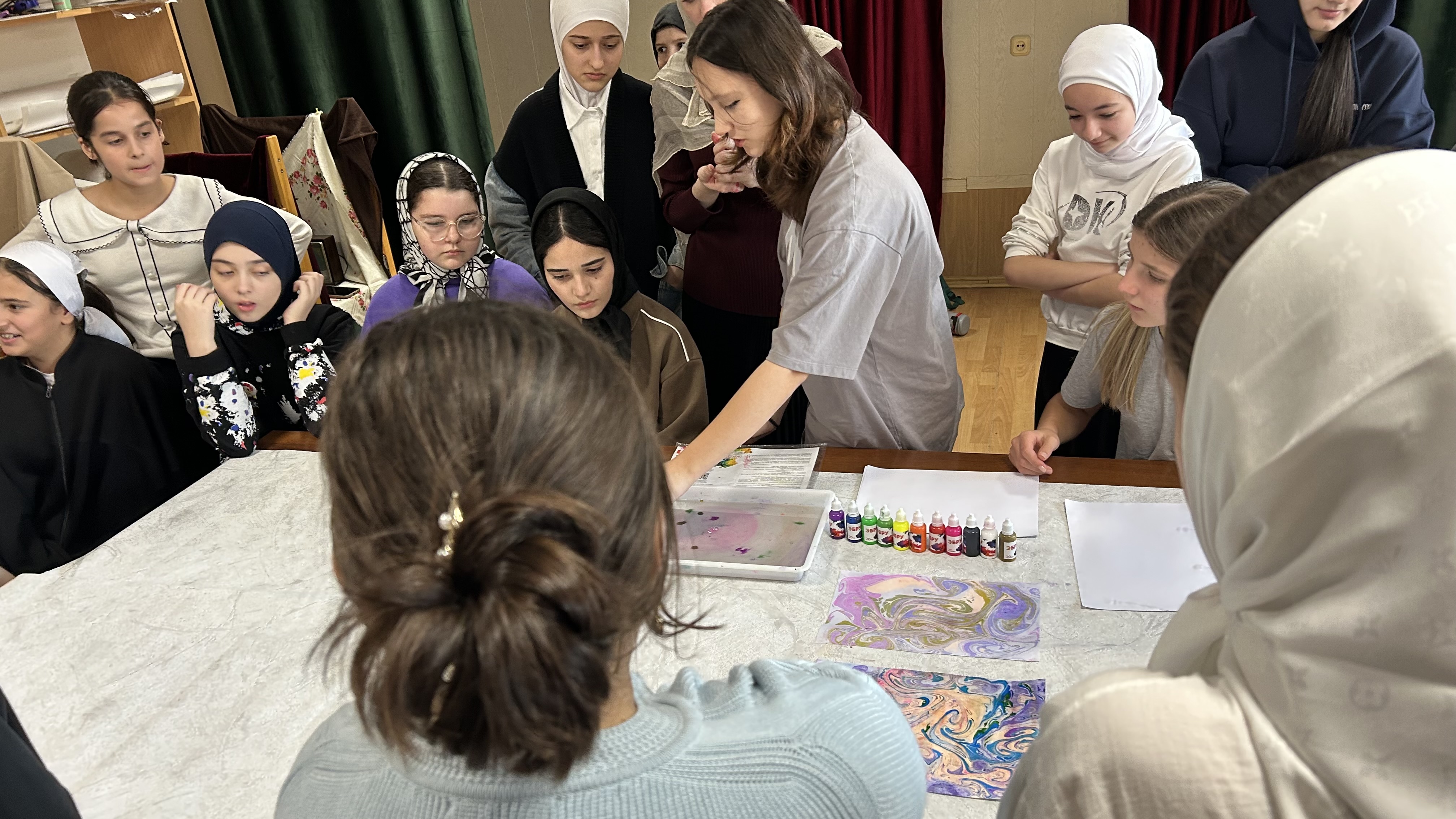 В актовом зале художественной школы прошёл мастер-класс, на котором художник рассказал о технике рисования на воде, показывая различные приёмы и способы создания узоров. Мастер обучил гостей, как создавать рисунки и разводы на воде, чтобы потом аккуратно перенести их на бумагу. Даже у тех, у кого не было навыков работы с красками, в результате получались настоящие произведения искусства.